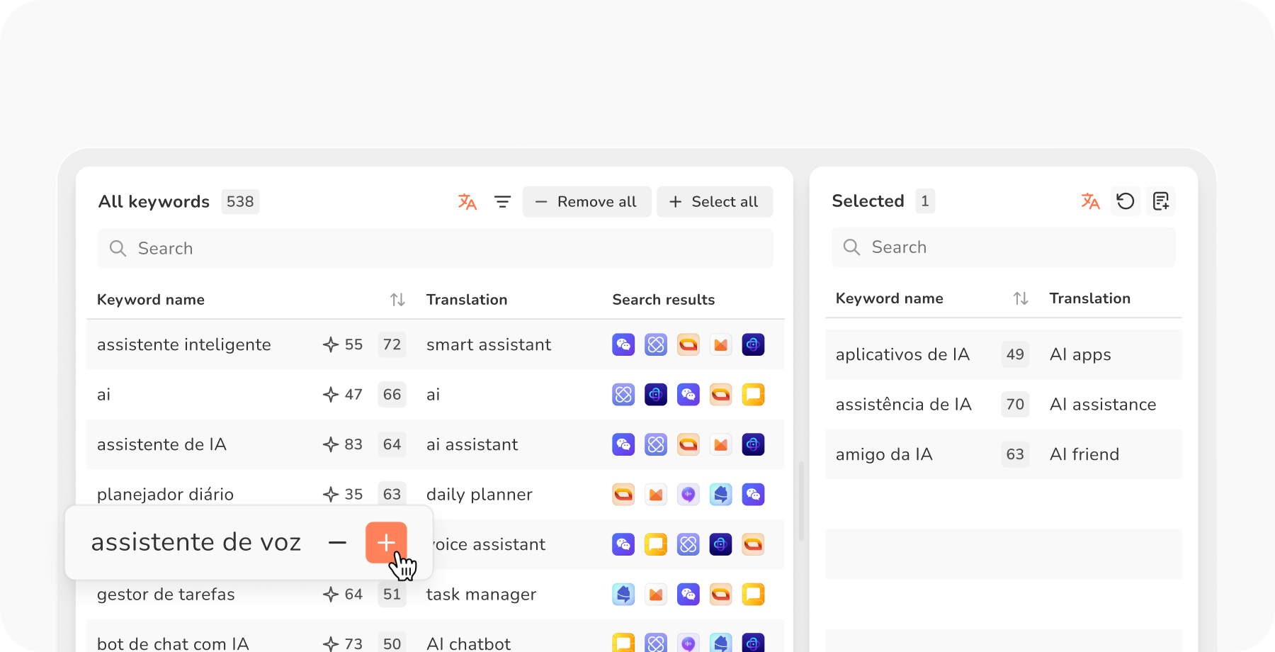 Select the most relevant keywords using translation, Search Ads popularity, and AI relevancy metric